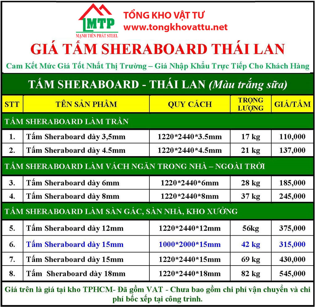 Bên dưới là bảng giá tấm cemboard Shera Thái Lan sỉ lẻ mới nhất 2021