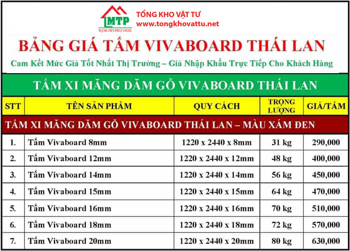 - Giá tấm Vivaboard Thái Lan sỉ và lẻ tại Tổng kho vật tư Mạnh Tiến Phát tốt nhất trên thị trường. Hàng luôn có sẵn với số lượng lớn tại kho.
