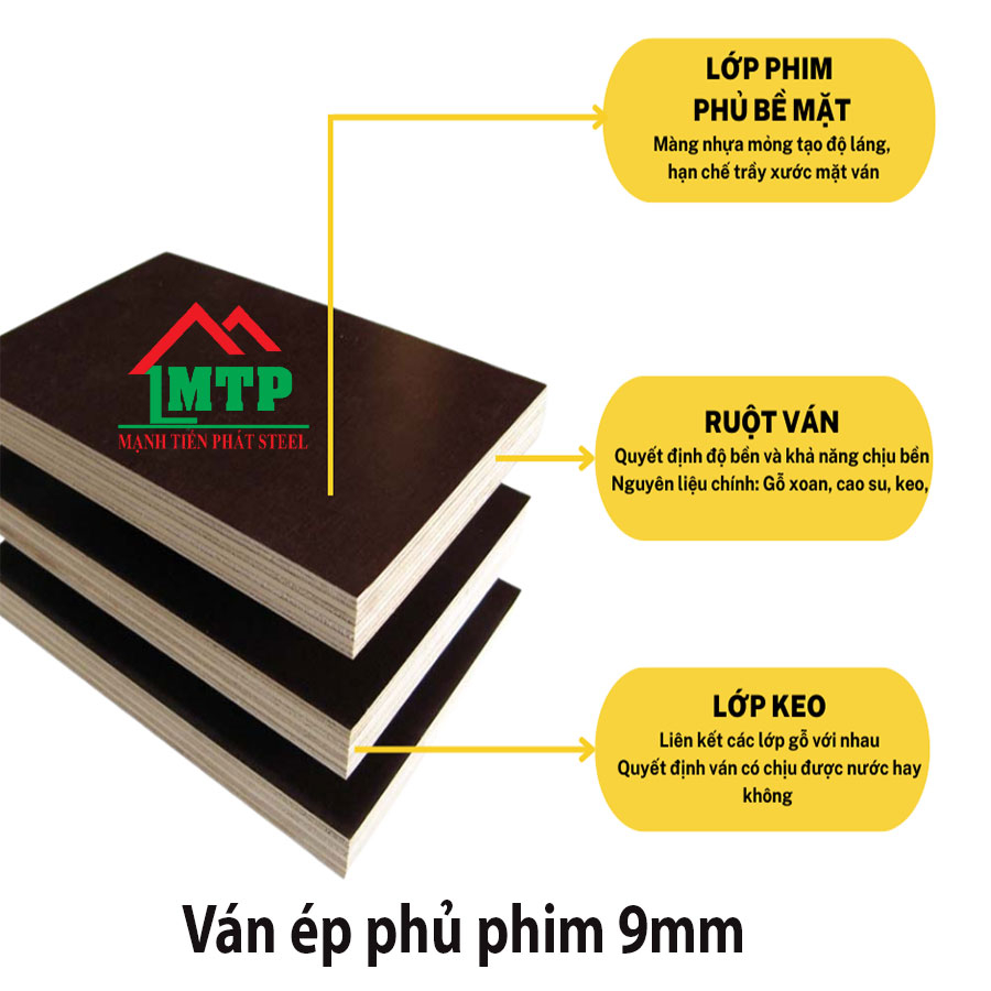 Ván ép phủ phim (film faced plywood) là loại ván ép công nghiệp được sản xuất từ các lớp gỗ mỏng (thường là gỗ keo, cao su, hoặc bạch đàn) liên kết với nhau bằng keo chống nước (WBP Phenolic hoặc Melamine) và phủ một lớp phim chống thấm trên bề mặt. Lớp phim này, thường có màu nâu hoặc đen, giúp tăng khả năng chống ẩm, chống trầy xước, và tạo bề mặt bê tông nhẵn bóng sau khi tháo cốp pha. Với độ dày 9mm, ván ép phủ phim phù hợp cho các công trình không yêu cầu chịu tải quá nặng nhưng vẫn cần độ bền và tính thẩm mỹ.