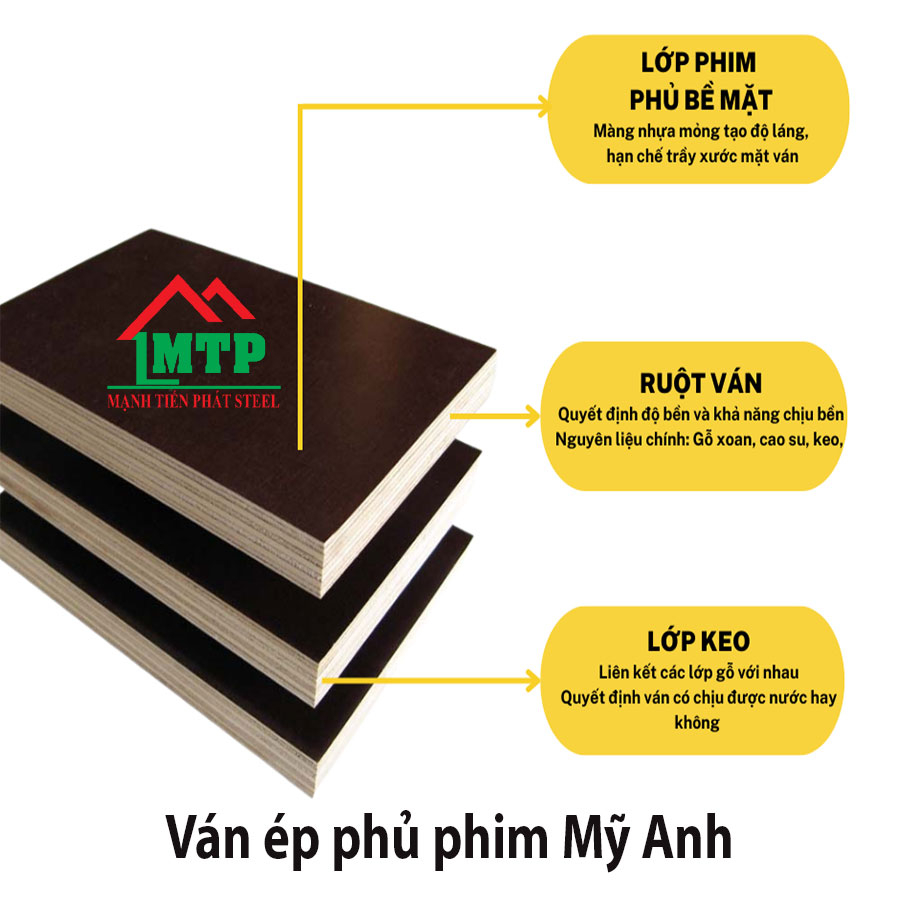 Ván ép phủ phim Mỹ Anh là sản phẩm ván ép công nghiệp được sản xuất bởi Công ty TNHH Việt Mỹ Anh, một trong những nhà cung cấp uy tín hàng đầu tại Việt Nam. Sản phẩm này được tạo nên từ các lớp gỗ mỏng (veneer) được ép nóng với keo chống nước chuyên dụng như keo Phenolic hoặc Melamine, sau đó phủ một lớp phim Dynea phenolic màu đen hoặc nâu trên bề mặt. Lớp phim này giúp tăng khả năng chống thấm, chống trầy xước và tạo độ bóng mịn cho bề mặt bê tông sau khi thi công.
