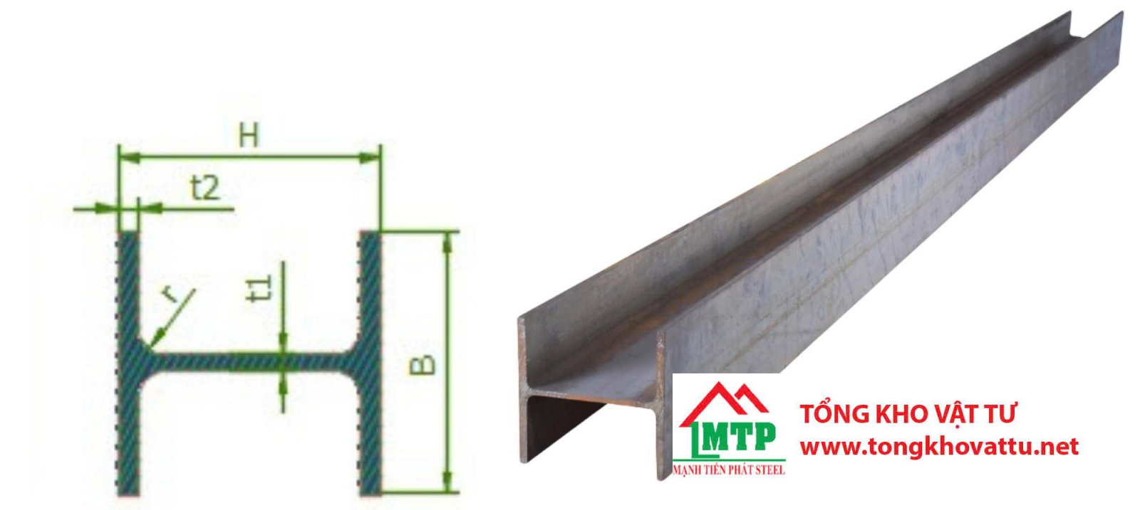 Kích thước chuẩn (mm) HxB T1 T2 R Diện tích mặt cắt ngang (cm²) Đơn trọng (kg/m) Momen quán tính (cm⁴) LX Momen quán tính (cm⁴) LY Bán kính quán tính (cm) IX Bán kính quán tính (cm) IY Modun kháng uốn (cm³) ZX Modun kháng uốn (cm³) ZY